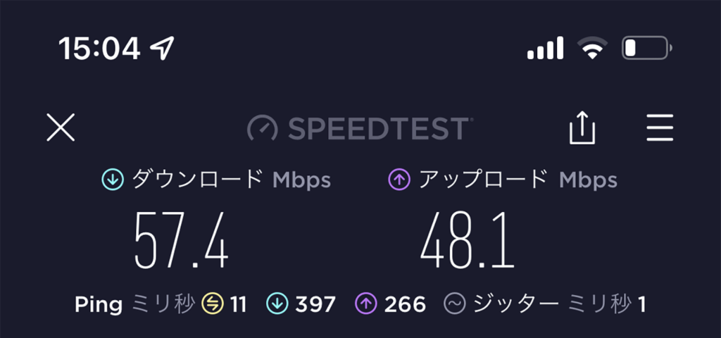 20Mbpsあれば、動画視聴も問題なくできるところ、セントレジス大阪は57Mbps。Zoomの打ち合わせも問題なくできます。