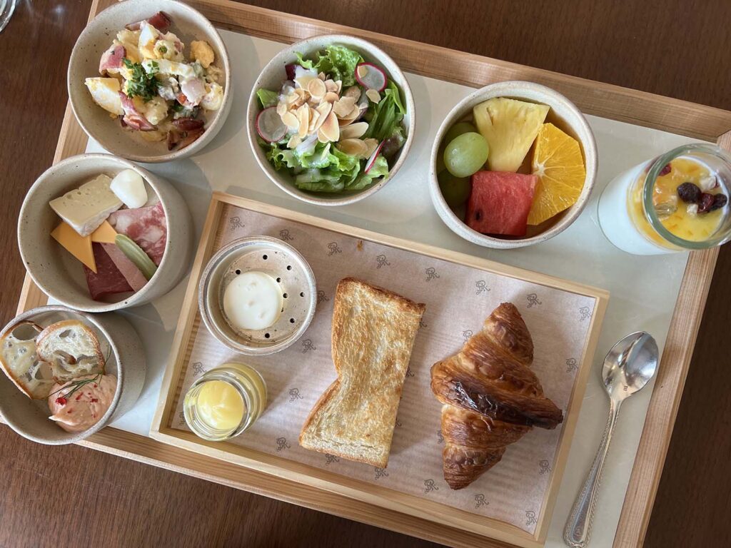 おしゃれすぎて。こんな朝食毎日食べたいですよね。サラダ、タパス系、サラダ、フルーツ、2種類のトースト。最高の洋食でした…。頼んでよかった…。
