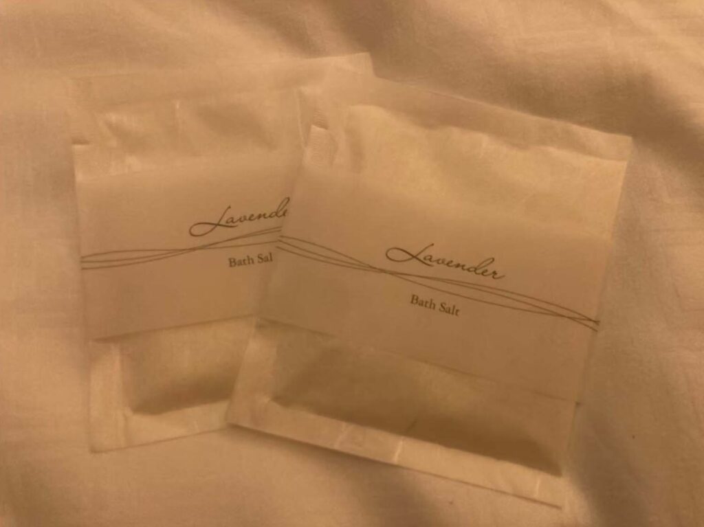 ラベンダーの香り。高級ホテルの楽しみはバスタイム!という方も多いはず。バスソルトはお部屋になくても、頼めば持ってきてくれることがあるので、ぜひ頼んでみてくださいね。