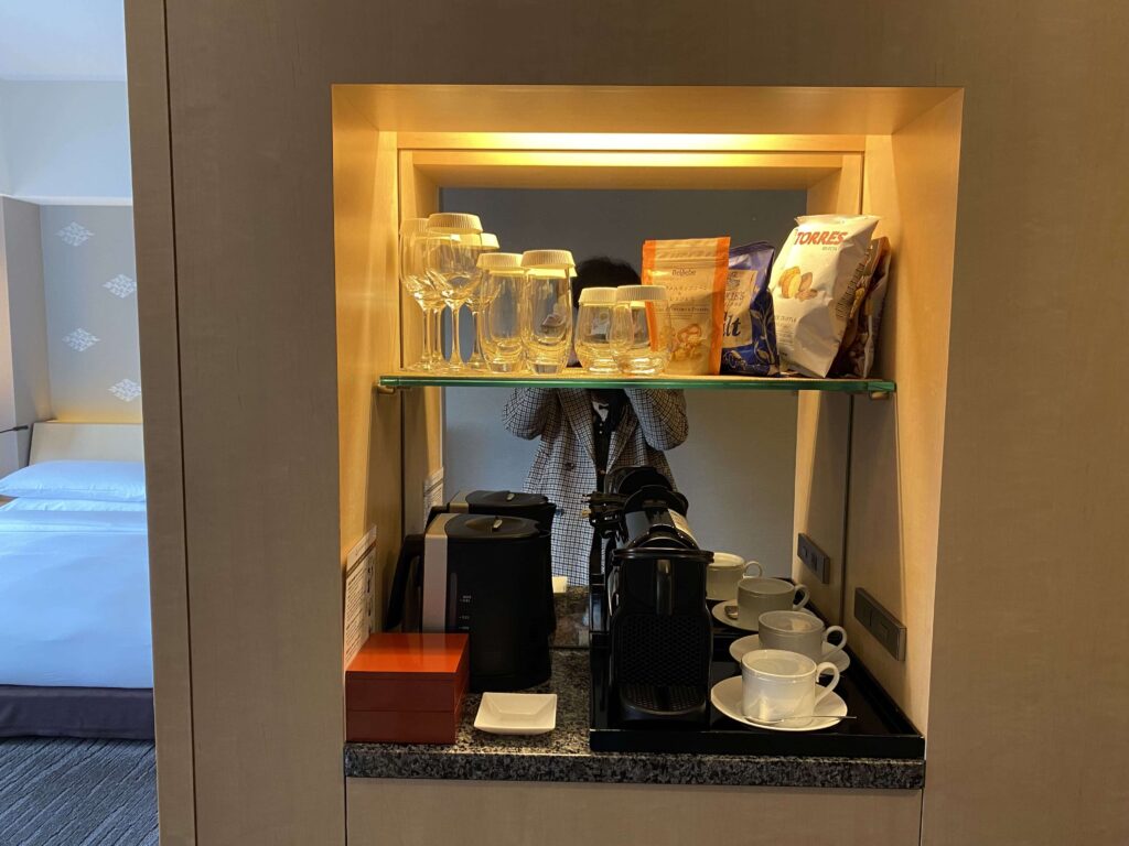 てなわけで、ここがミニバーゾーン。お菓子やネスプレッソなどが揃っています。