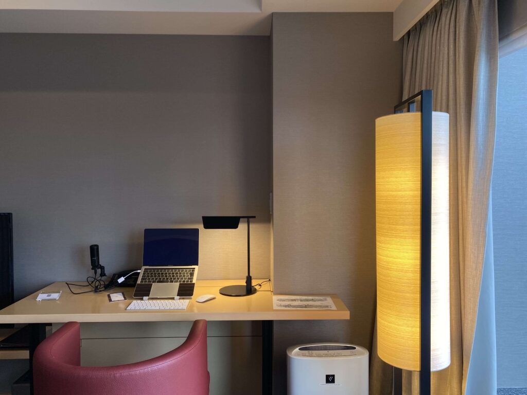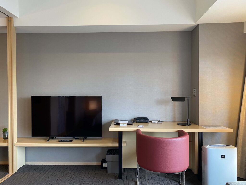 このご時世、季節もあって空気清浄機の設置は当たり前になりました。ないホテルに不信感を抱くほど(笑)仕事のしやすそうなデスクに40型くらいのテレビが設置。