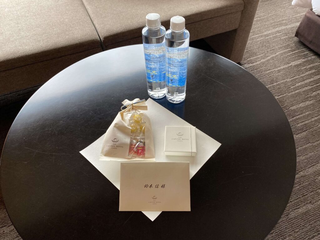 水とチョコレート、お菓子と水が置かれていました。お菓子は一休.comのダイヤモンド特典。嬉しいですね。