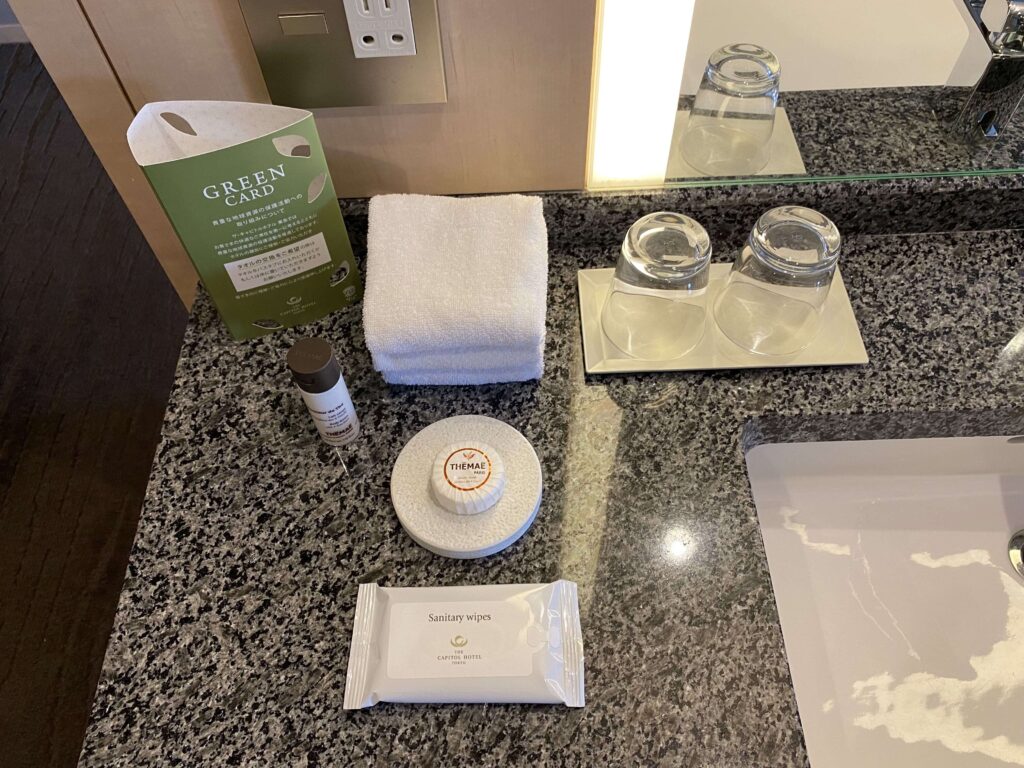 左側にはウェットティッシュや石鹸、タオル。歯磨き用のグラスが配置。