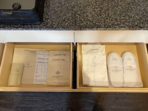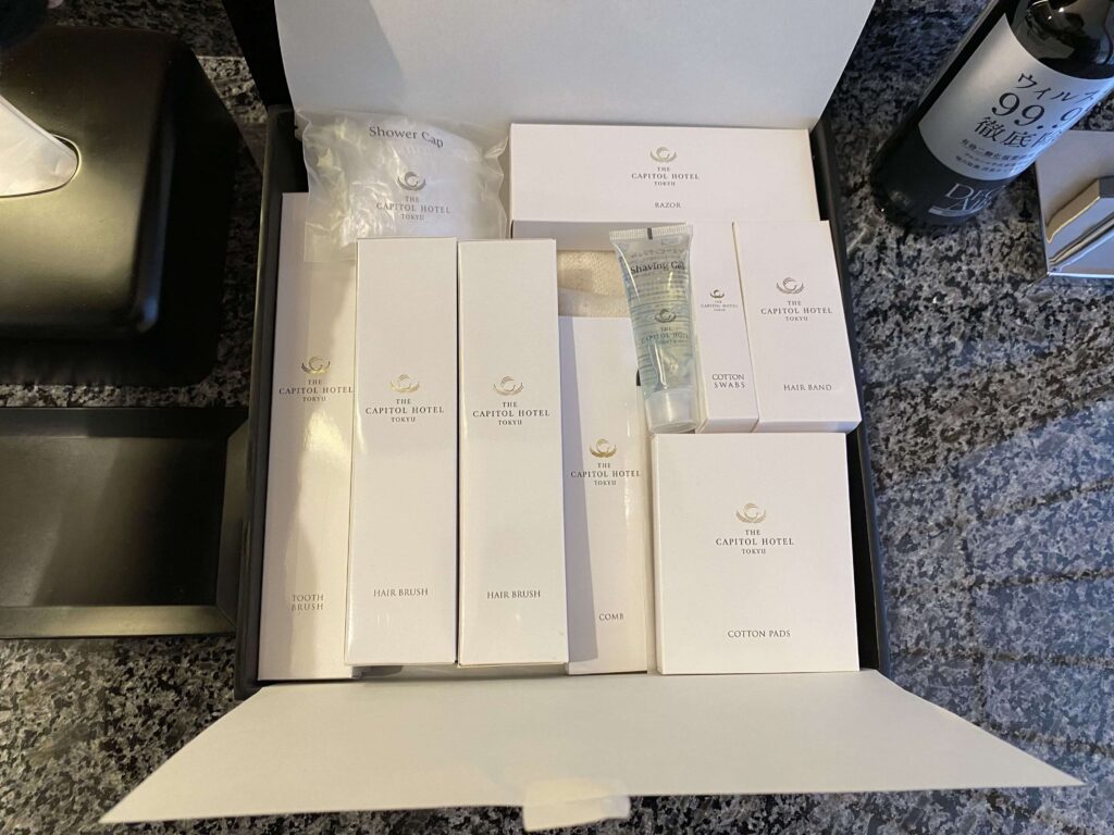 反対側には、きれいに入れられたアメニティボックス。歯磨きやくしなどアメニティグッズが一通り揃っていました。