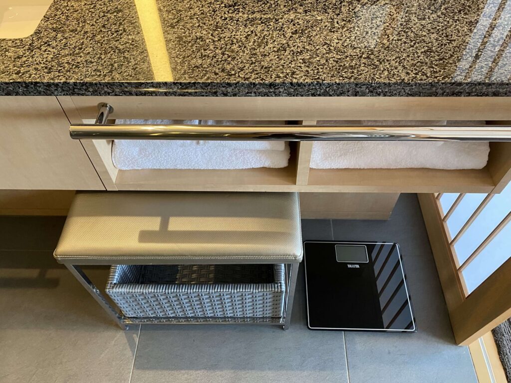 床にはきれいにタオルが配置されており、TANITAの体重計も配置。嬉しいですね。
