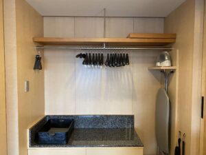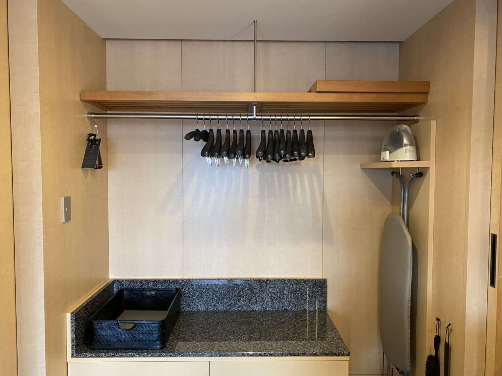 右のゾーンには、このようなクローゼットゾーンがあって、ハンガーやアイロン&アイロン台などが配置されています。