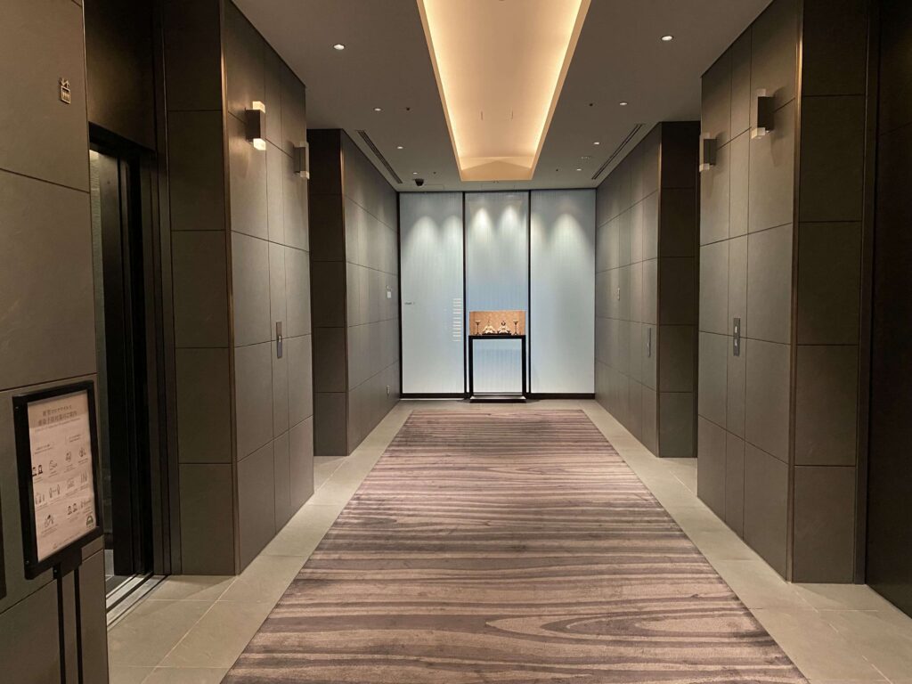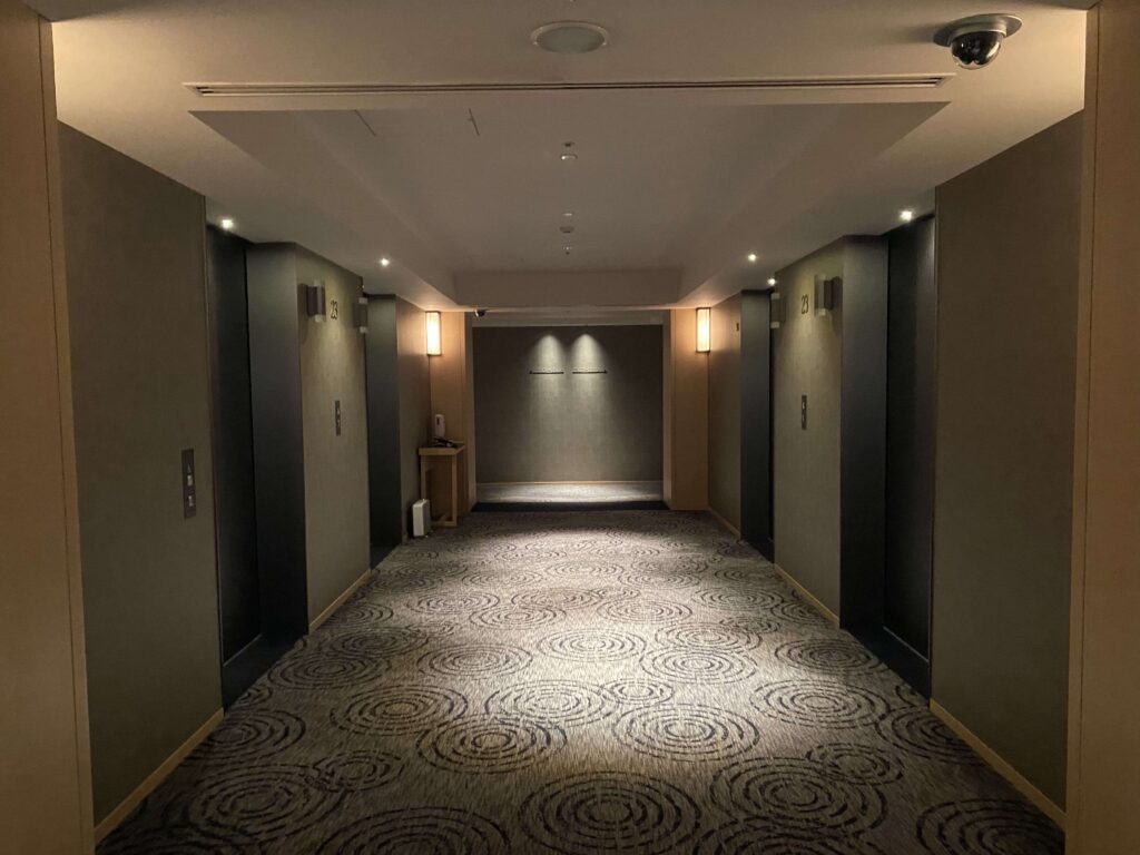 こちらが客室フロアのエレベーターフロア。より和の要素が高まりましたね!じゅうたんの円のデザインが印象的。