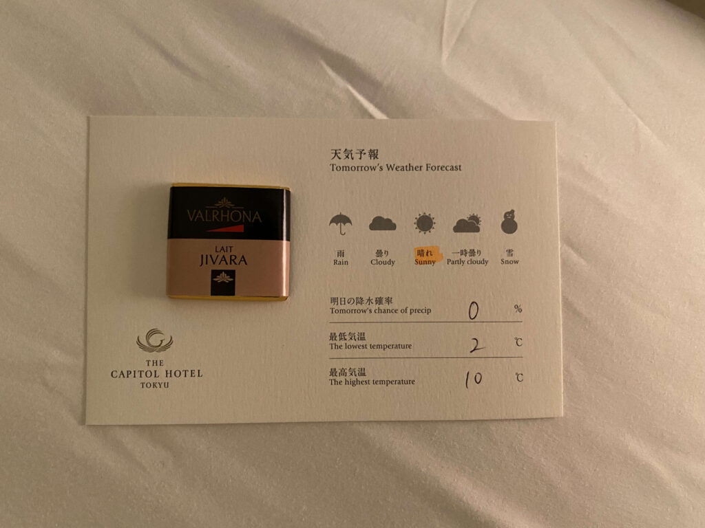 チョコレートと天気予報まで!天気予報が分かる書面まで!天気予報があったのは、椿山荘と雅叙園だけだったな…と。
