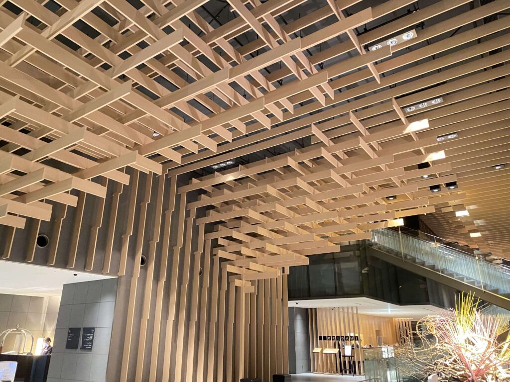中に入ると、ここにザ・キャピトルホテル 東急の代名詞でもある「斗栱」が。存分に隈研吾ワールドを感じてください。