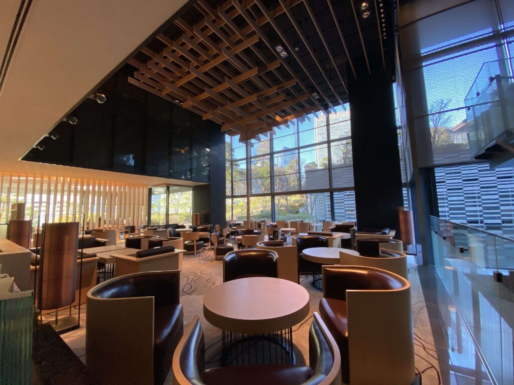 ザ・キャピトルホテル 東急らしい空間が演出されていて、天井には隈研吾氏のデザイン。天井がとても高いので、開放感を十分に味わうことができます。