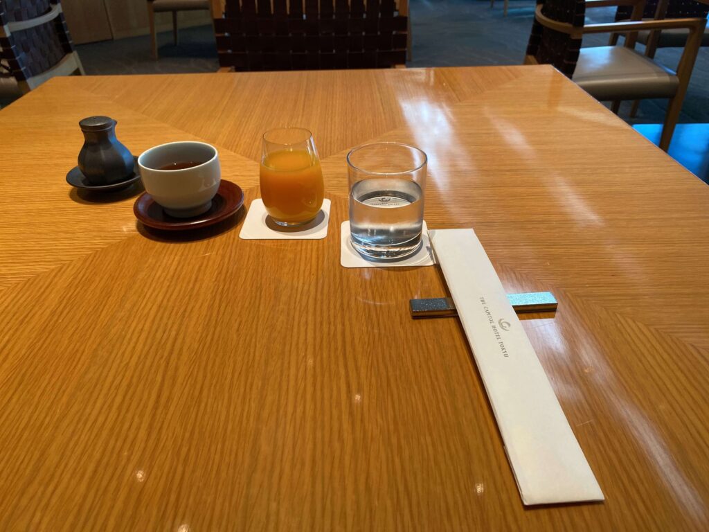 ▼飲み放題のオレンジジュースと、和食を選択したので、ほうじ茶。