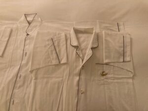 寝巻きはセパレート型じゃないワンピース型。これあんまり好きじゃないので、勝手に減点。ポリエステル50%、綿50%だそう。