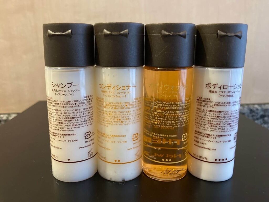 バスアメニティは2007年にフランスで誕生したスパブランド「THEMAE(テマエ)」。緑茶、白茶、赤茶、黒茶それぞれの特性を活かした4種のブレンドの複合成分(チャ葉エキス:エモリエント成分)が調合されているこだわりのアメニティ。どことなく、ヒノキの匂いがしてとてもお気に入り。