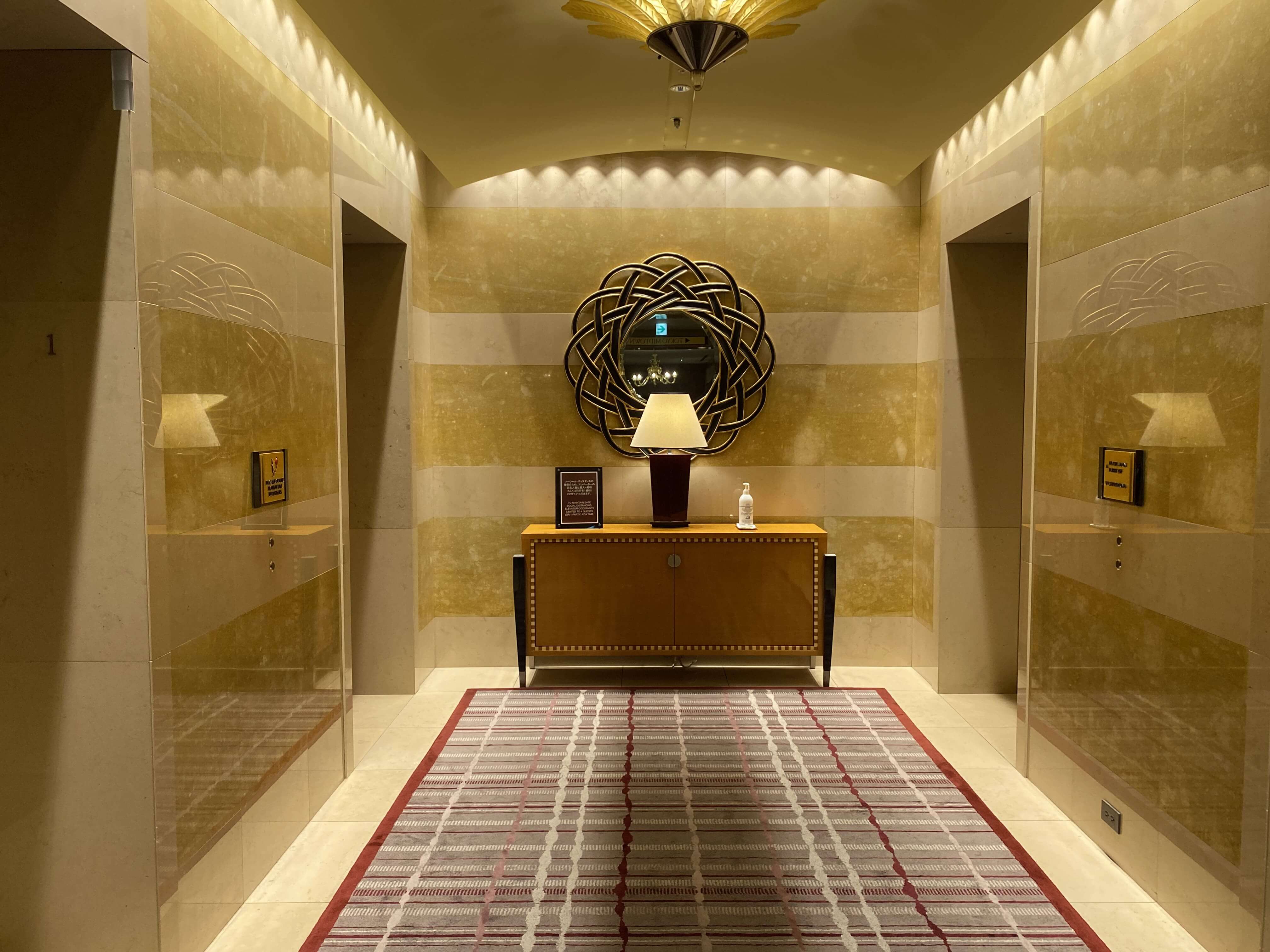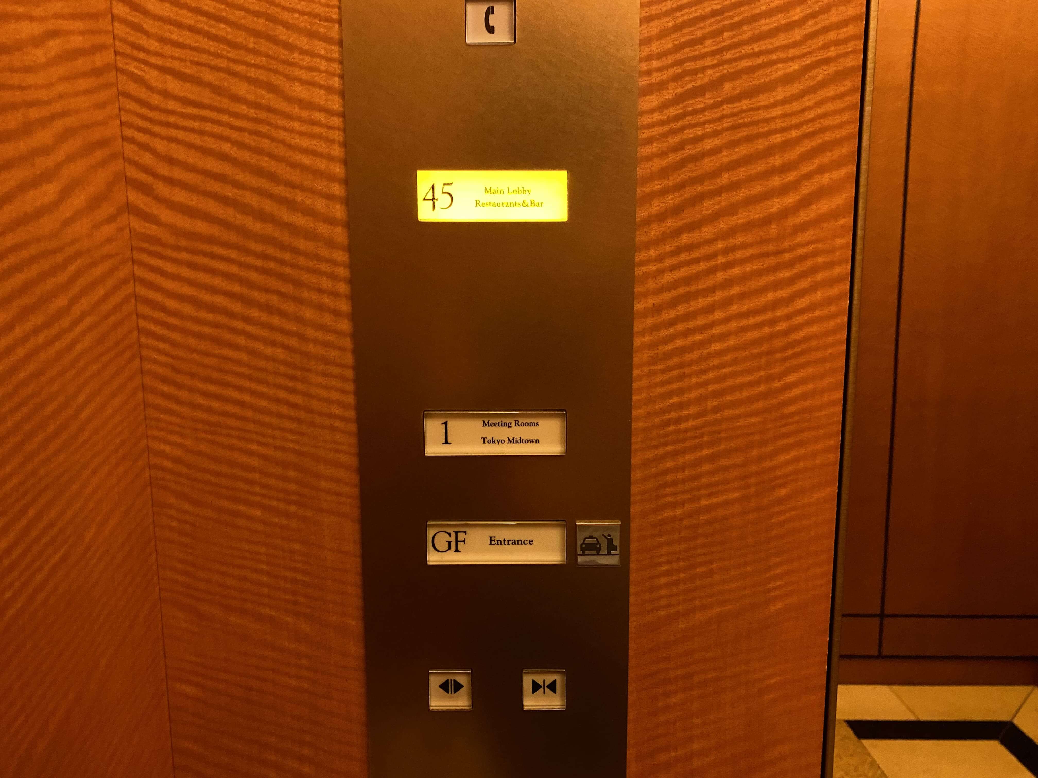 てことで、こちらがレセプションフロア45階に行くためのエレベーターホール。こうやって大理石が使われた空間ってなんでこんなにも高級感がかもしだされるんでしょう…。