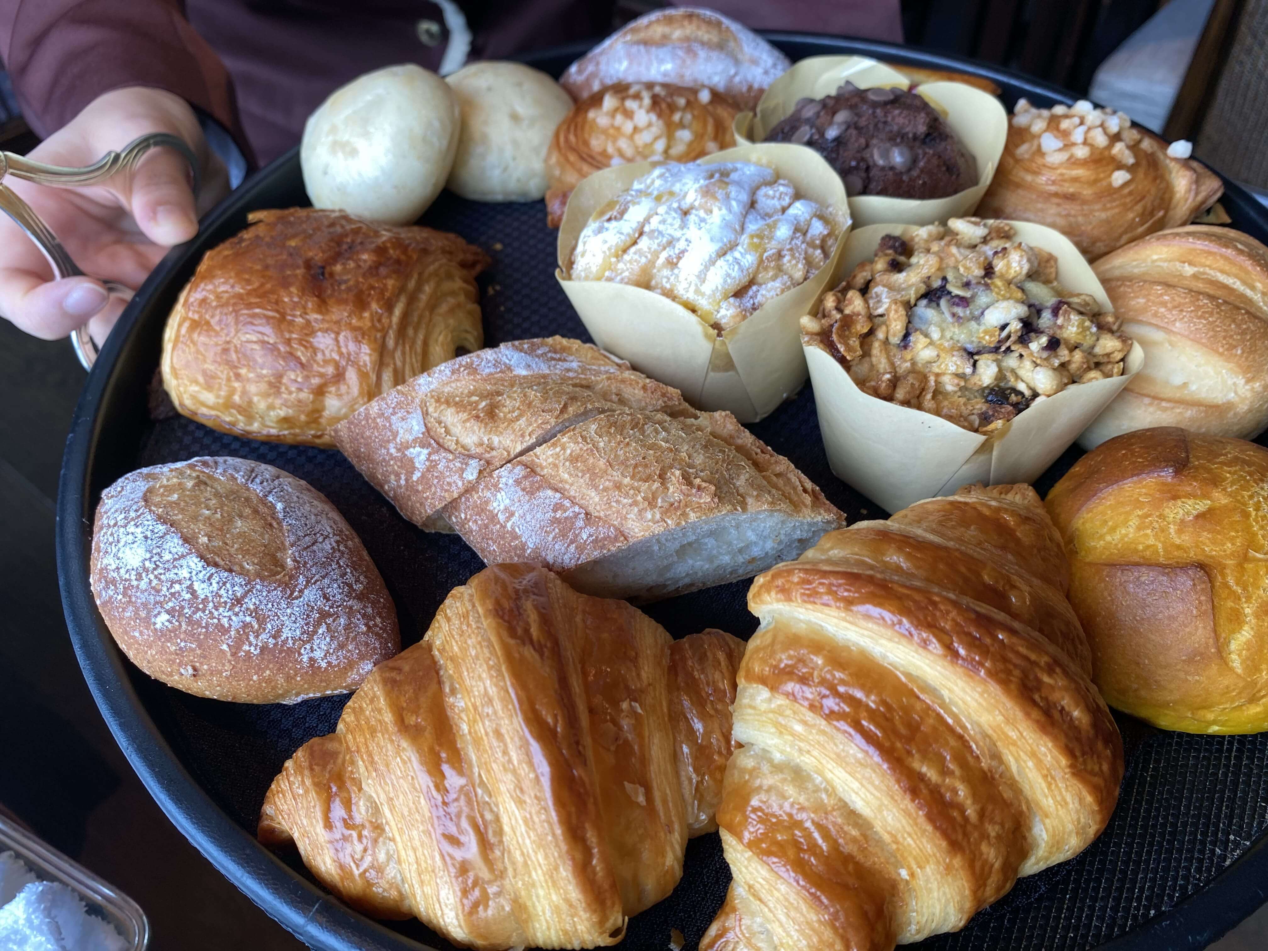 途中、パンの提供も。朝は普段プロテインだけの人間で、あまり食べないので遠慮。