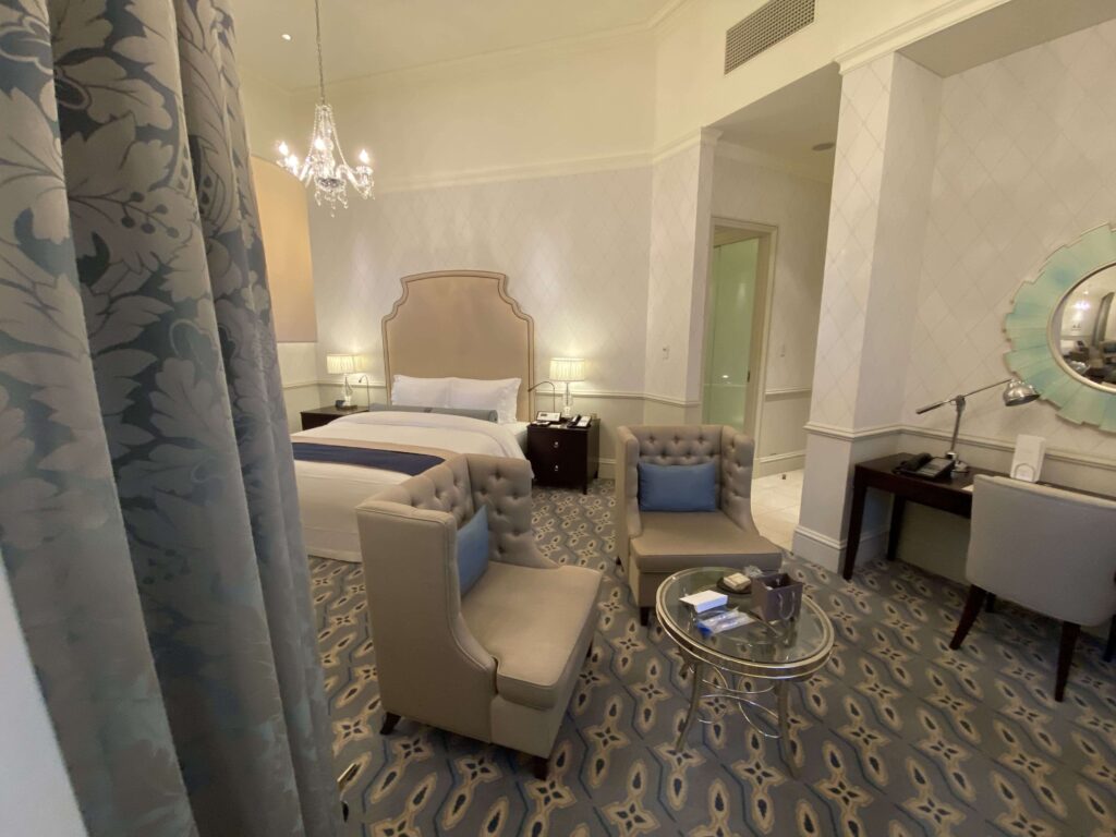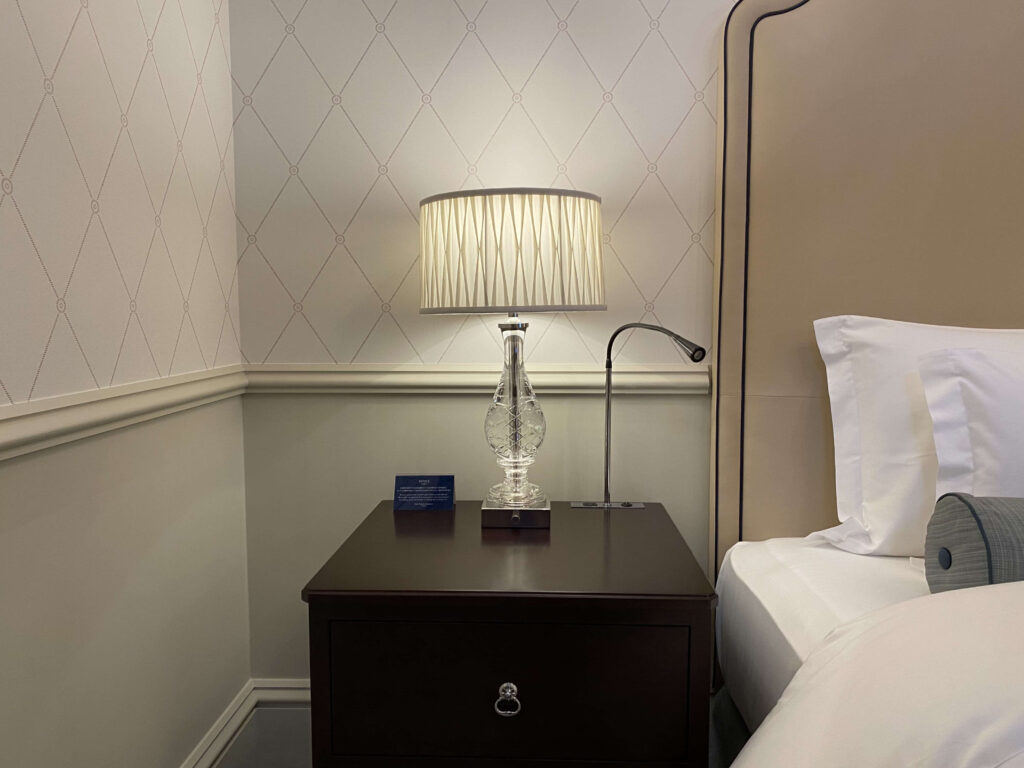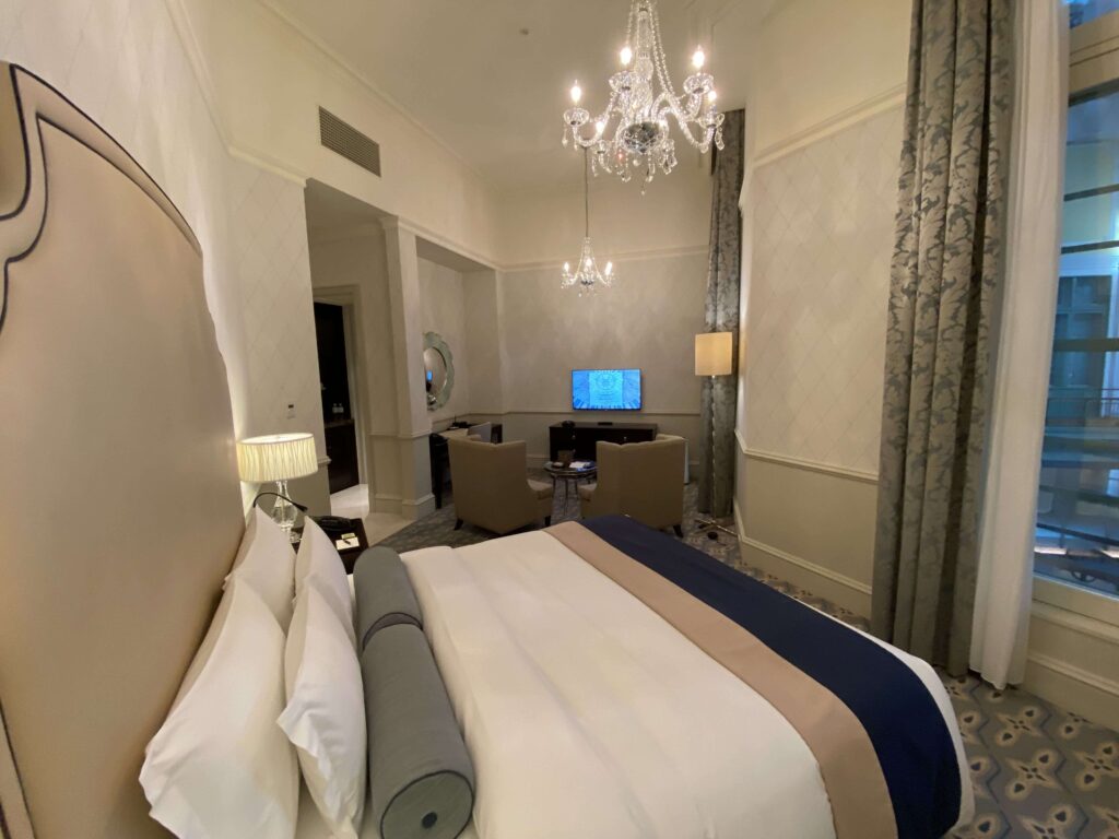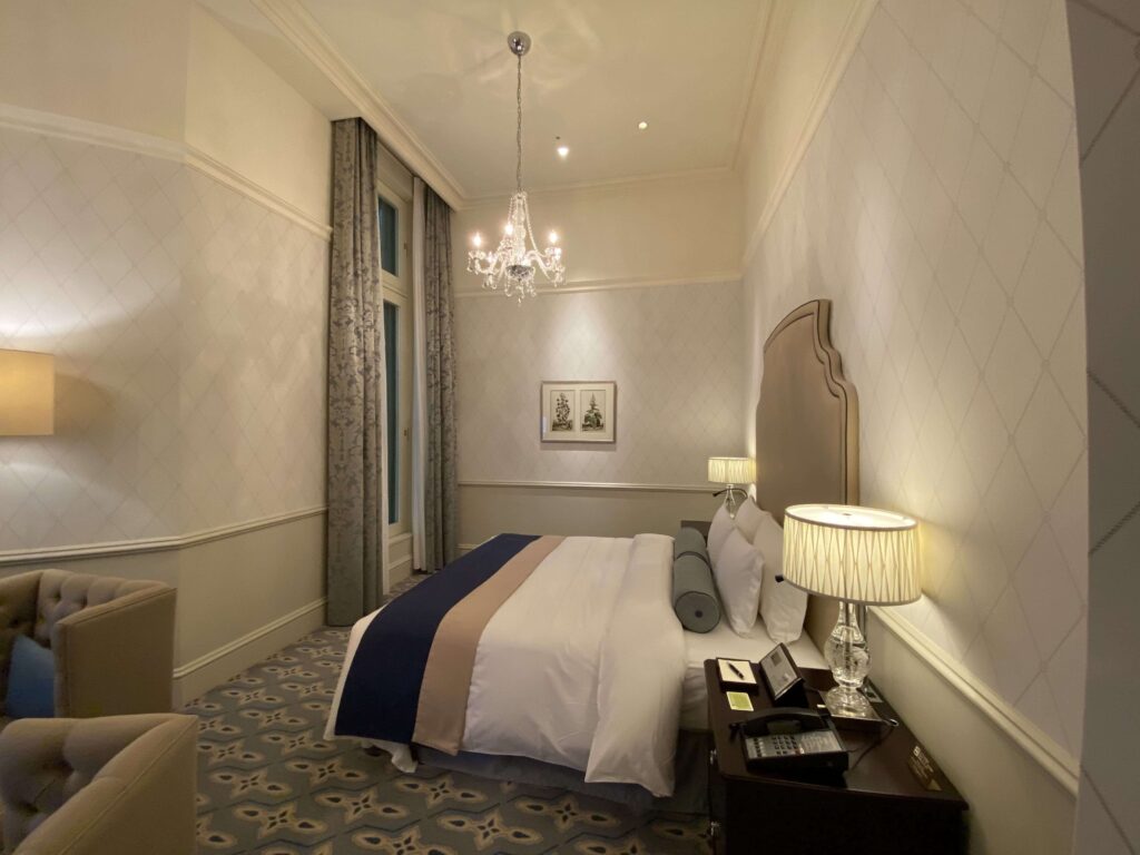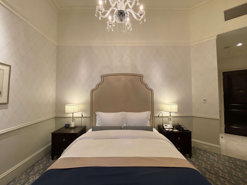 高さが4mあるということで、とても開放感があるお部屋。おしゃれなシャンデリアが空間をより引き立てていますよね。ベッドは、シモンズ社のものを利用。結構ベッドの硬さとかも気になっちゃう僕ですが、最高の寝心地でした。