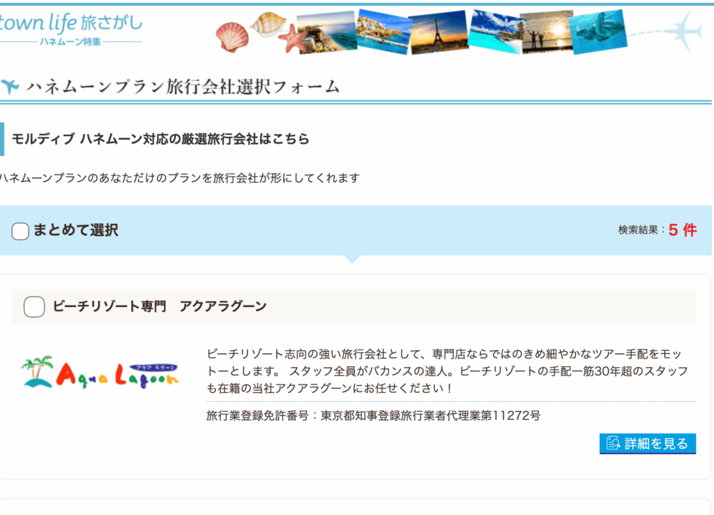 トップはこんな感じ。基本的に人気のハネムーン先は、全方面対応しているようです!