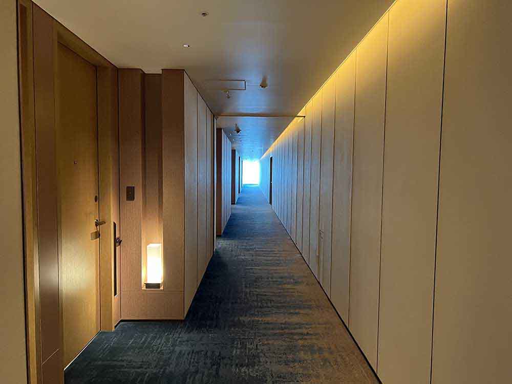地味にラグジュアリーホテルの個性がでるのが、この廊下。ウェスティン横浜の場合は、絨毯が海のイメージ、その他柱や壁はナチュラルな感じ。できたばかりということもあり、非常に清潔感もあり、来てよかった〜と思う廊下ですね。