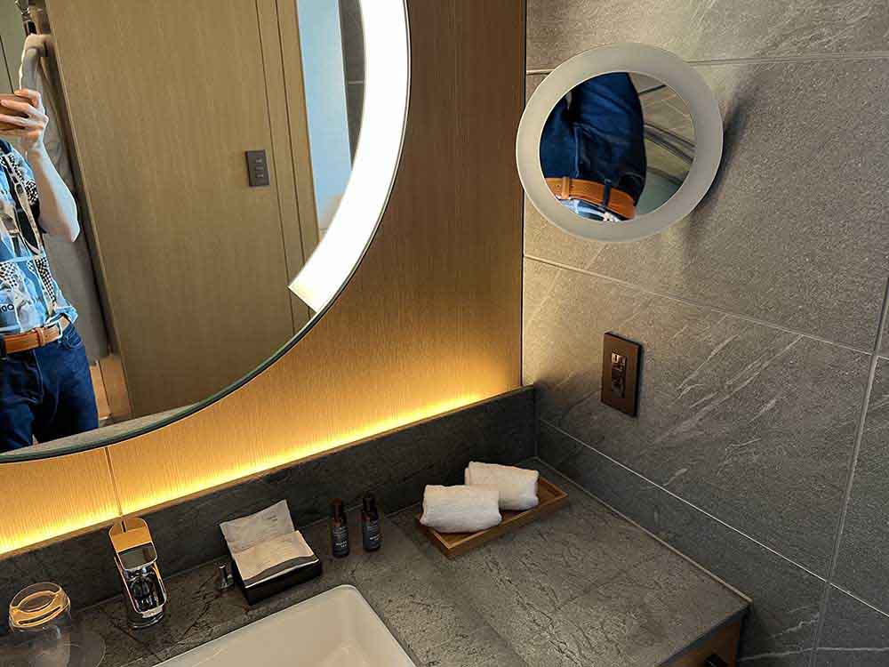 高級ホテルといったらの拡大鏡。そしてお手拭き用のタオル。この手を拭くためのタオルがあると「ああ、いいなあ。」と思ってしまう僕。