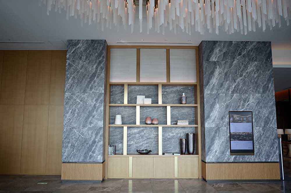 大理石がふんだんに使われたレセプション。緑もほどよく疲れており、高級感があるといえども、なんだか日本家屋に重要な要素(岩や木)が使われているので落ち着いた気分になれました。